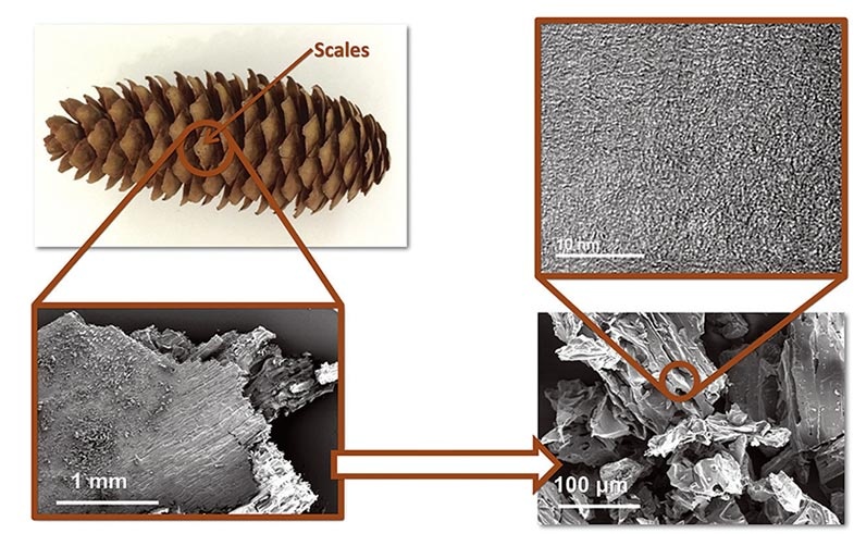 “Spruce cones are biomass waste, rich in carbon-based lignocellulosic compounds, intrinsically porous, abundant in nature, but are not being effectively utilized at the moment,” he said. “They can be collected from urban areas and forests, and thus they are a low-cost raw material to generate effective porous carbons for CO2 capture.”