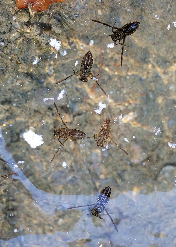 While most insects in the Hemiptera order are land-dwelling (including stink bugs and assassin bugs), a few, such as these backswimmers, are aquatic. In the fall, when most insect hatches have ceased, backswimmers come into their own, sculling through the water with their oar-like hind legs, preying on all forms of life, including tiny fish. They breathe under the ice by using oxygen bubbles like mini aqualungs. Like most aquatic insects, backswimmers supercool their bodies by producing antifreeze compounds called cryoprotectants, which allow them to tolerate sub-freezing temperatures. When there’s a thin layer of ice on a pond and no snow covering it, you might want to peer through the ice to see if you can see any of these cold-hardy creatures. Just be sure you don’t fall in, as I did two seconds after this photograph was taken.