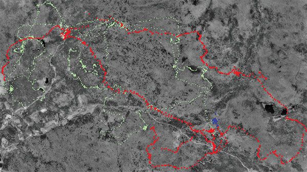 Doesn’t travel? While it may not seem important to know how long a bear sleeps or rests, this information is crucial to understanding bear behavior. The collar gives location and time readings, says Cooke, “So you can say, ‘Holy cow, she’s just going back and forth – cleaning out all sorts of berries or something.’” Cooke points out that the data will show bears exhibiting such behaviors as staying put for longer periods of time as they fatten up for winter in a berry patch, searching in late autumn for a good hibernation spot within a certain area, or even covering a lot of ground in a short time, a behavior that points to a need for further investigation.