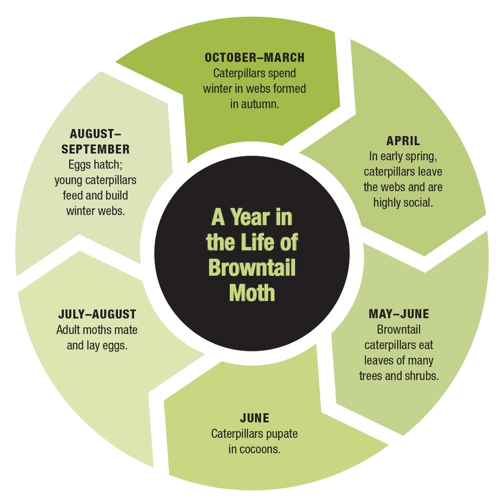 | June | Caterpillars wander, pupate. | Avoid contact with caterpillars and pupae. Both have irritating hairs. |