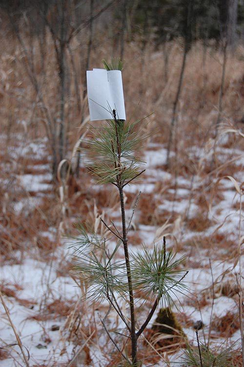 Well, maybe there is. Meet the budcap, a simple tool that’s used extensively in the northcentral parts of the country. The idea is that if you wrap a piece of paper around the terminal leader and bud of a tree, a browsing deer can’t get to it. You do this in the late fall, before snow covers the ground. Just fold a 4” x 6” piece around the tree’s leader to form a sleeve, then staple the paper together at least three times, catching some needles as you go. Come spring the budcaps just fall off on their own. Reapply them each fall until the tree is out of reach of deer.