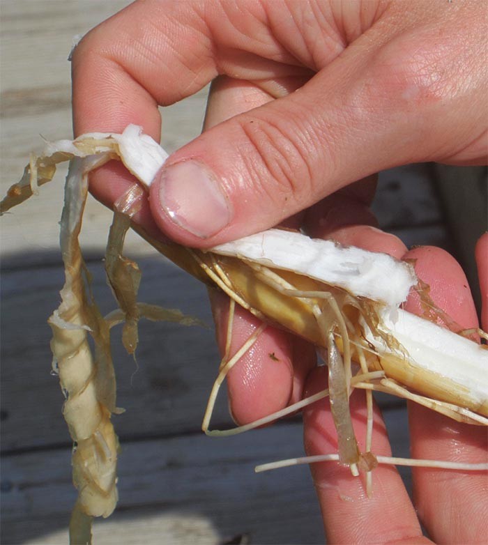 The cattail rhizome looks like a strange, reddish-brown, alien tentacle with rings of threadlike roots every few inches along its length. The outer layer is spongy and inedible. Remove this outer layer with your thumbnails, pushing off the spongy rind without pulling up any of the core’s fibers. It takes a bit of practice to get this right. The inner core should be firm, fibrous, and white. Any cores that aren’t should be thrown out.