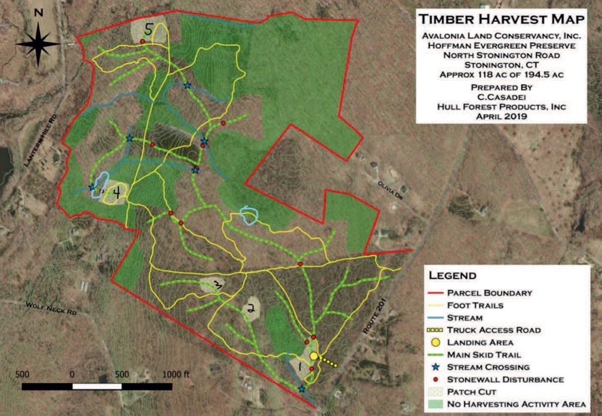 As forest conditions continued to decline, and concerns about visitor safety from hazard trees increased, Avalonia leaders began to explore active management options. In 2018, after multiple consultations with forest ecology experts, including a free assessment by Connecticut Audubon, the Avalonia board of directors contracted Hull Forest Products to clear five patch cuts (a total of a little more than 6.2 acres) and to selectively thin other areas, with a focus on removing dead and dying trees. In order to pay for the project, Avalonia and Hull planned for a timber sale. Work was scheduled to begin in autumn of that year, but in yet another example of climate change disrupting expectations, soft ground conditions that winter necessitated a delay. The cut went forward in autumn 2019. All told, approximately 60 acres of the preserve were affected, including patch cuts, thinned areas, and skid trails.