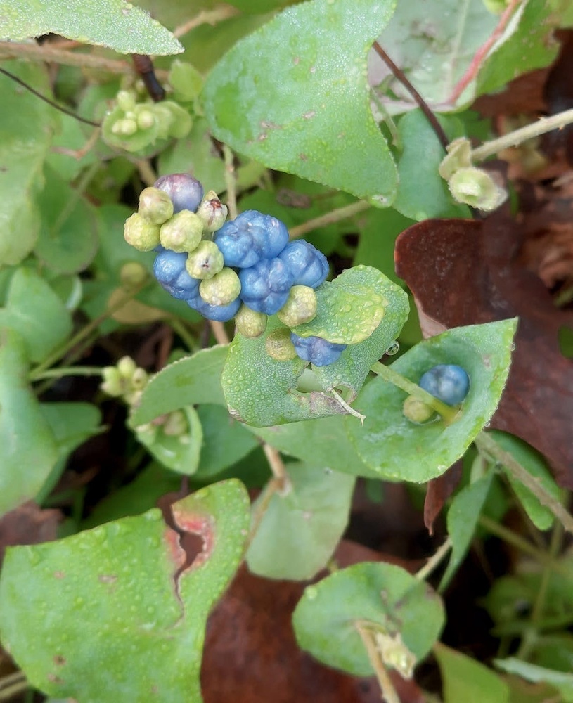 Like many other invasives, mile-a-minute is an attractive plant, with tiny white flowers that bloom in spring and metallic blue fruits that appear in July and persist into early autumn. Its distinctive leaves are triangular, with barbs along the leaf veins, on the petioles, and on the stems. The barbs aid the plant in its vertical growth by attaching it to other plants or structures. Smaller, circular leafy structures called ocreae surround the stems at the base of the leaf petiole.