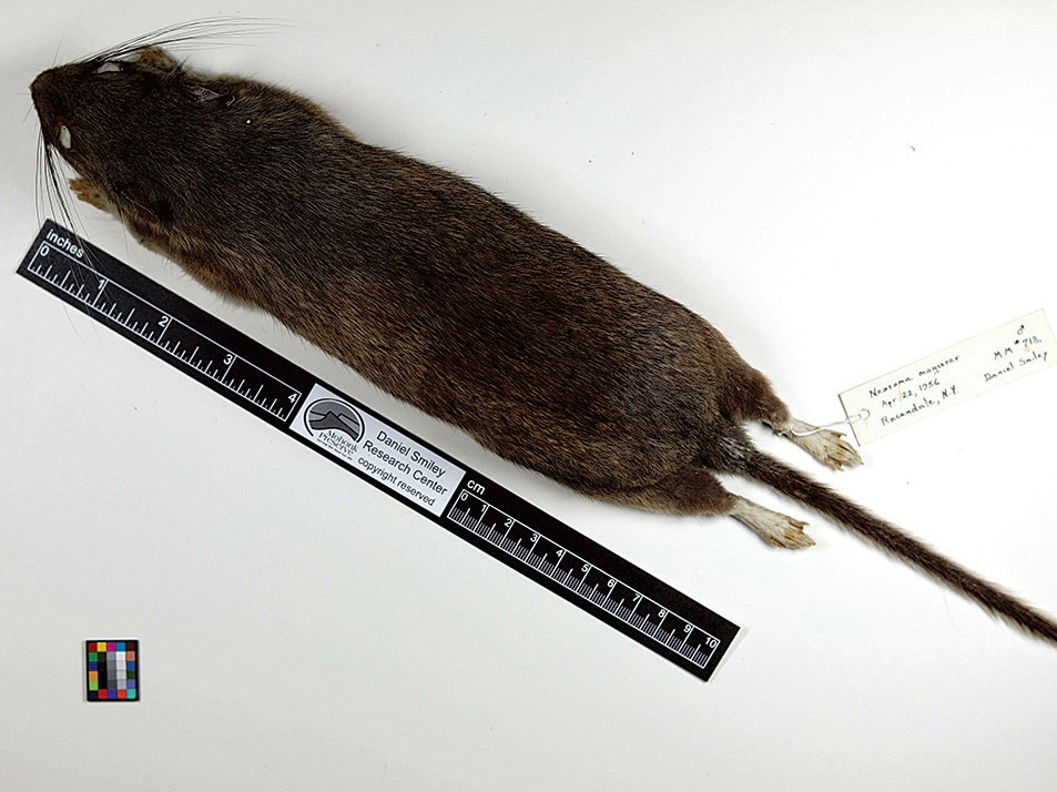 The mammal collection includes four specimens of the gray-squirrel-sized Allegheny woodrat (Neotoma magister), the second largest North American rat. The preferred habitat of these nocturnal vegetarians is within talus boulder fields. Daniel Smiley, Jr. compiled numerous reports of trapped Allegheny woodrats and/or scat within the vicinity of Mohonk from the 1930s through the 1970s, and he was the first in the state to notice their population decline. By 1987, Allegheny woodrats were considered extirpated in New York State. Mohonk’s historic woodrat data was used in a 1993 Department of Environmental Conservation study that looked into the population decline. Researchers released 30 radio-collared woodrats around Mohonk, all of which were found to be dead within a year of release. The primary cause of death was found to be raccoon roundworm (Balyisascaris procyonis).