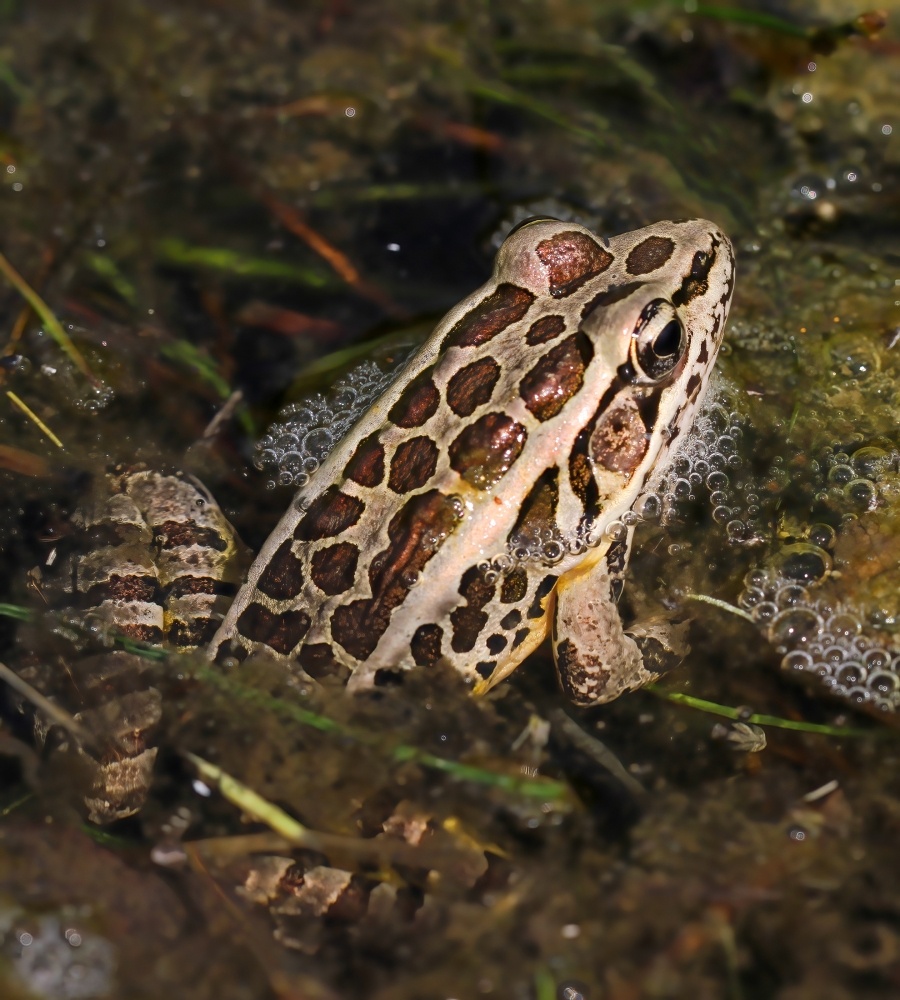 Pickerel frogs emerge early in spring from their muddy, pond-bottom hibernacula. They mate in April and May in the Northeast, and males call to attract females for four to six weeks. The calls resonate inside their internal vocal sacs located between their tympanum (eardrum) and foreleg, unlike spring peepers and American toads, whose vocal sacs are located directly under their mouths. Pickerel frog calls resemble short “snores,” which last a second or two. The call is similar to the sound made by running your thumb across a comb’s teeth. Pickerel frogs call from underwater as well as on top of mounds of vegetation.
