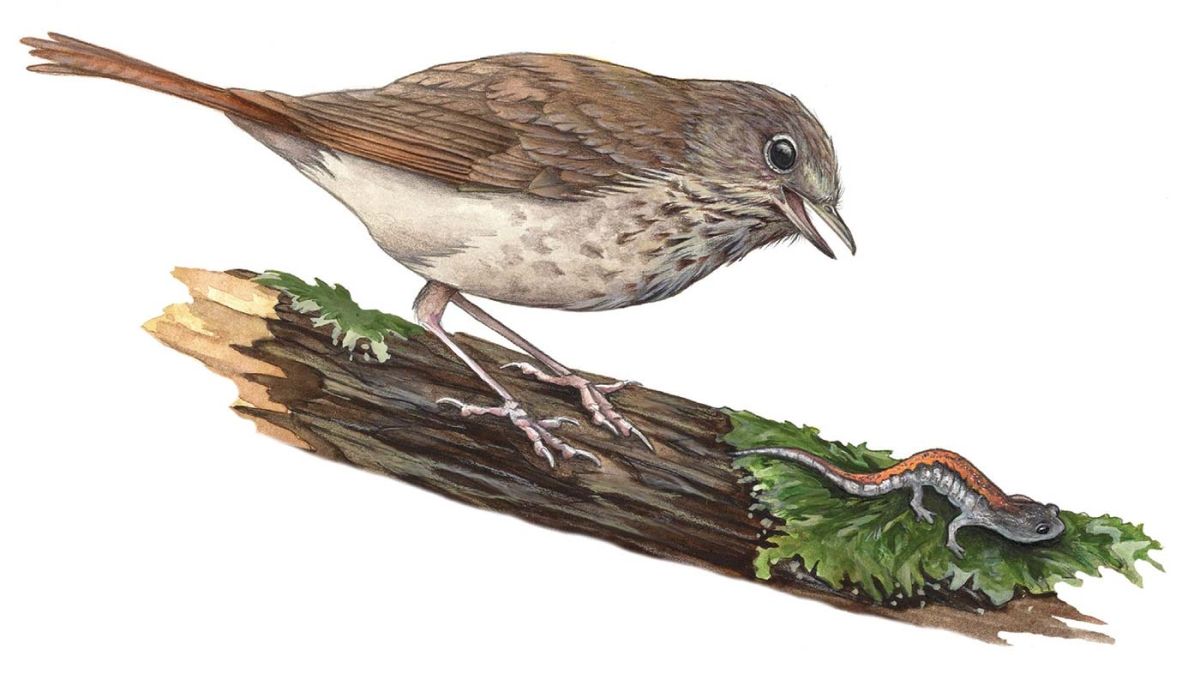 That night I looked up all the references to hermit thrush that I could find in my small natural history library. Although the foot quiver had been observed before, it had never been associated with feeding. Some old-school ornithologists had noted the occasional red-backed salamander in the stomachs of thrush they had shot, but there was nothing that associated this food with the foot quiver. Had we discovered something new? I knew that red-backed salamanders were a major biomass component of the northern hardwood forest; could this finding be significant?