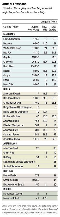 There are trends in longevity as well. The clearest is this: the larger an organism is, the longer it tends to live. The lowly common vole, even in the comforts of captivity, won’t make it much past three years. Captive red foxes have seen 21 years; captive black bears have made it to 34. This large-small divide often mirrors predator-prey relationships. A mature cougar, a whopping 138 pounds on average, can live to be 18 years in the wild. On the other end of the food chain, eastern cottontails, a wimpy 2.75 pounds, max out at five years and average only 15 months.