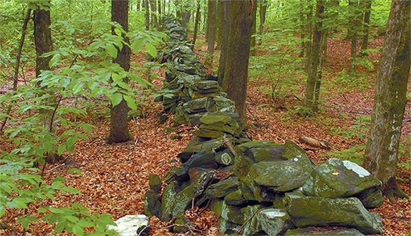 A tiny fraction, maybe. Most, no. Stone walls were often made in conjunction with wooden fences for livestock; farmers chucked stone under the fence rails to get it out of the way. “It’s a linear landfill,” said Thorson. Later, the wooden fence rotted away. Some farmers did tidy up their stone walls. And during the Gilded Age, said Thorson, wealthy industrialists bought rural farmsteads and rehabbed them, hiring people to turn the thrown stone walls into architectural features. Thorson noted that in New England, fences were regulated by towns and generally were required to be four feet, six inches to five feet, six inches tall to keep cows out of the neighbors’ corn. “There are very few stone walls in the woods that are that high. They’re basically knee-high to thigh-high. That means they were not fences or walls in and of themselves.”