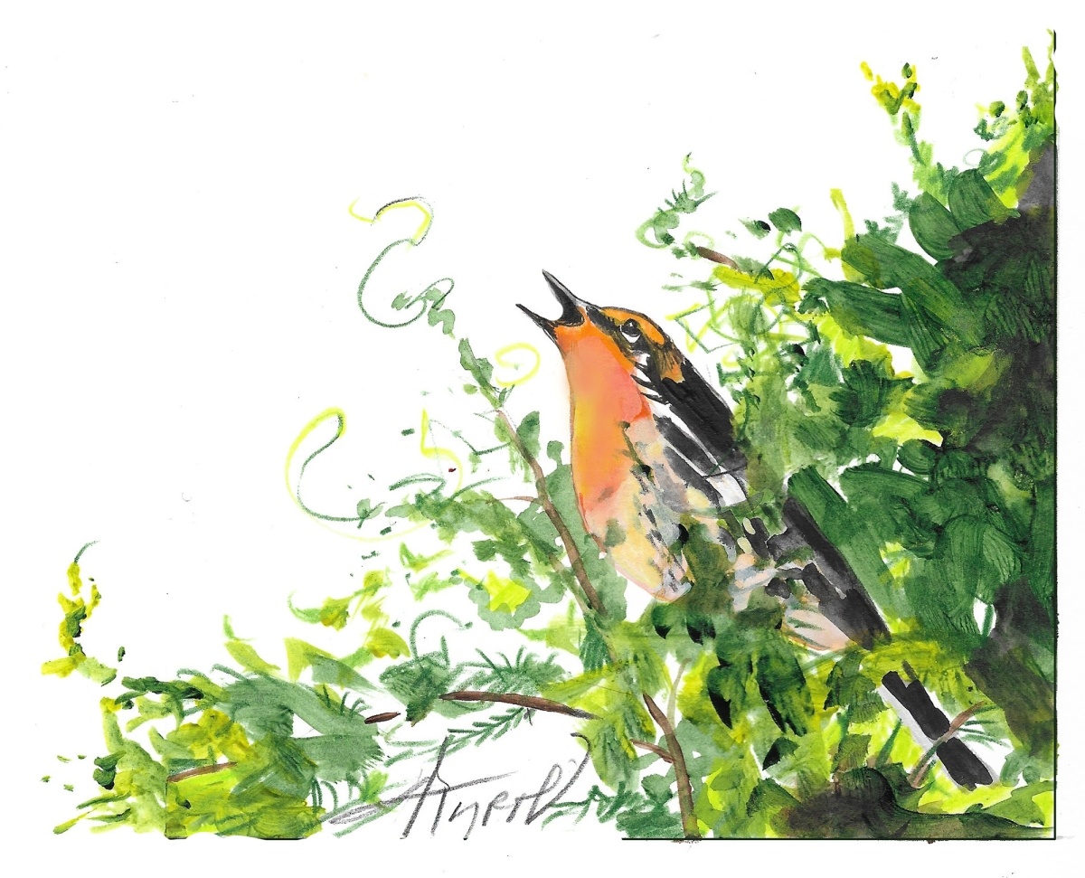 My first Blackburnian was singing its day song, an increasingly rapid series of two-note phrases ending with a slightly longer one. I would need to be up before sunrise to hear the dawn song, a series of quick rising whistles followed by a high-frequency chatter and ending with such high notes that most people cannot hear them. Kroodsma describes the beginning phrase of the dawn song as sounding like the bird is juggling pebbles in its throat.