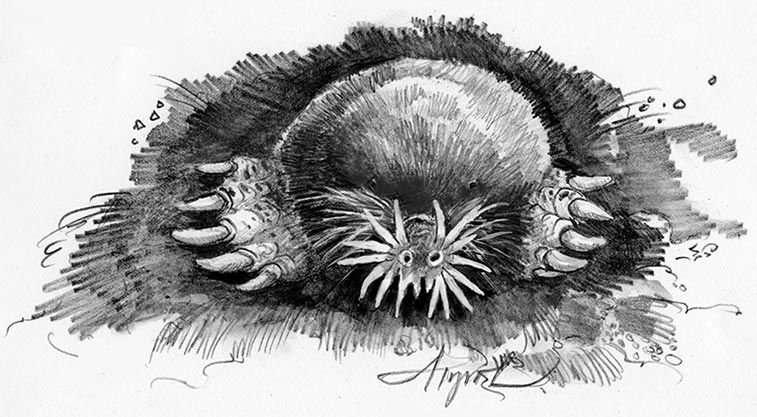 Moles are fascinating creatures specialized for underground living. Though they resemble rodents, they are insectivores, and are more closely related to shrews. Shaped like an Idaho potato, moles have a reduced pelvis and hind legs, enabling them to turn easily in narrow tunnels. Powerful shoulders and front legs and shovel-like feet with heavy claws and a sixth digit aid in digging.