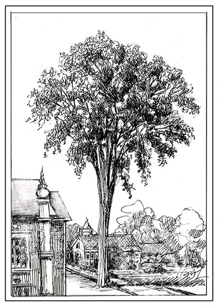 As we walked along Tuck Drive, Beaty pointed out a row of young staked elms. They are cultivars – crosses of mature trees that have most likely been exposed to the disease many times, but appear to have some natural resistance – although not complete immunity – to infection. Among the better known varieties are Princeton, Valley Forge, and Liberty.