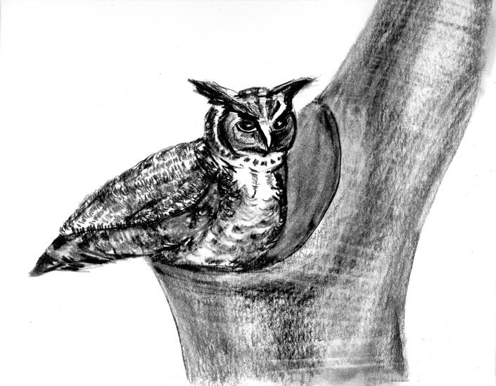 Great horned owls are widespread in New Hampshire and Vermont, but because of their nocturnal habits and their tendency to avoid people, they are not commonly seen. A careful observer might spot one during the day by looking high up in the trees in a densely wooded area. This bird is an excellent camouflage artist, though. In New England, their plumage is brown and buff with black barring, so they blend into the tree trunks. Their prominent, widely spaced ear tufts distinguish them from their more common cousin, the barred owl.