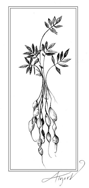 I first came across the Apios americana a few summers ago while hiking along the Ompompanoosuc River in Vermont. Tucked within a tangle of riverside vegetation were sweetly scented white and maroon flowers. They were spaced along twisting vines that held tight to other plants. The flowers – with their intricate folds and prominent keel – were clearly of the pea family. But it wasn’t until I looked in my field guide at home that I realized the plant’s real treasures were underground. If I had dug down just a few inches beneath the soil, I would have unearthed bulbous swellings growing along the thin, woody roots of this plant. While these tubers typically range in size from a grape to a walnut, they can grow as big as a russet potato.