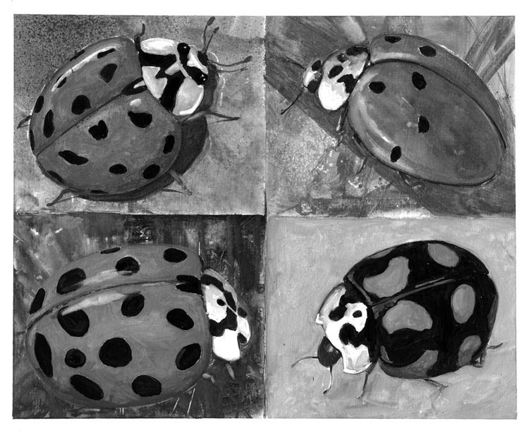 Properly, they are not bugs or birds; they are beetles. This species is unusually varied in appearance, ranging from pale orange to deep red, occasionally with no spots and sometimes with as many as 16 spots, but they do have a distinctive feature: between the wings and the head, on the prothorax, are markings in black and white that can be read as a “W” or an “M.”