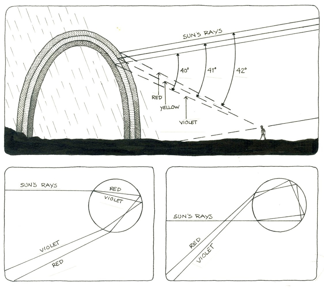 Today we understand more of the science behind rainbows. A rainbow forms when sunlight is separated into its spectrum of colors by the refraction (bending) and reflection of water droplets. It’s easier to understand the physics if you consider what happens when a ray of sunlight passes through one raindrop suspended in the air. According to the National Oceanic and Atmospheric Administration, as light enters a raindrop, it is refracted, or bent to a different angle. Some of this light is then reflected by the curved, inner surface of the raindrop, and when it hits the other side of the raindrop, is refracted again, back out to the observer.