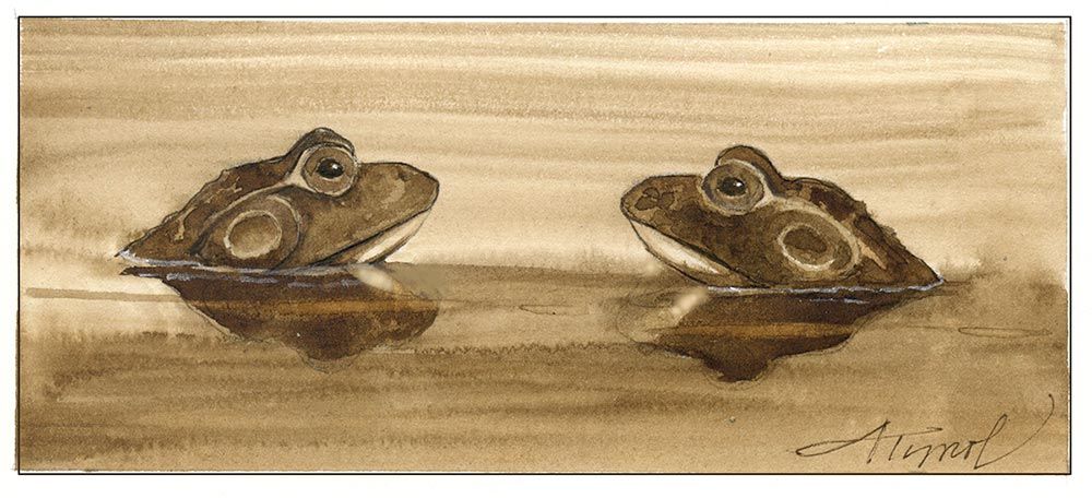 If you walk by a pond on a summer evening, you may hear the deep “jug-o-rum” of a bullfrog or the “tung” of a green frog, sounding like a plucked banjo string. Sometimes you’ll hear a whole chorus of frogs, the songs competing with each other for attention.