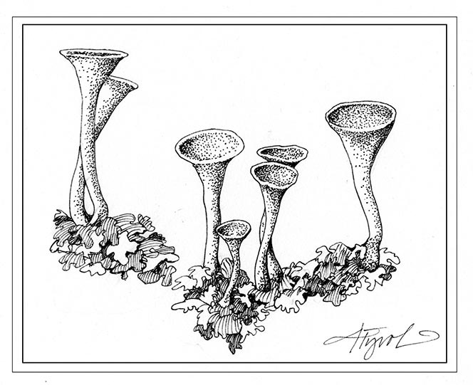 Other lichens are easier to spot: the reindeer moss (which is not a moss, despite the name) common in spruce-fir forests and subbed for trees in model train setups; old man’s beard, which grows on trees and looks like, well, you know; lungwort, a big, broad-lobed lichen that turns bright green when wet; British soldiers, whose red tops that make them look like miniature matchsticks, grow from the forest floor.