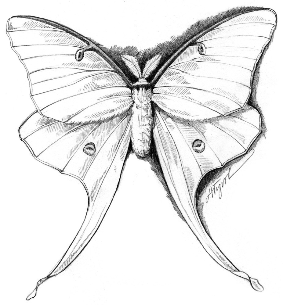On early summer nights I sometimes see large, pale green moths with long, twisted tails fluttering near our porch light. Later, I often find them dead on the ground. These beautiful moths are luna moths, named for the Roman goddess of the moon. Each of their four wings has a transparent, moon-shaped eyespot.