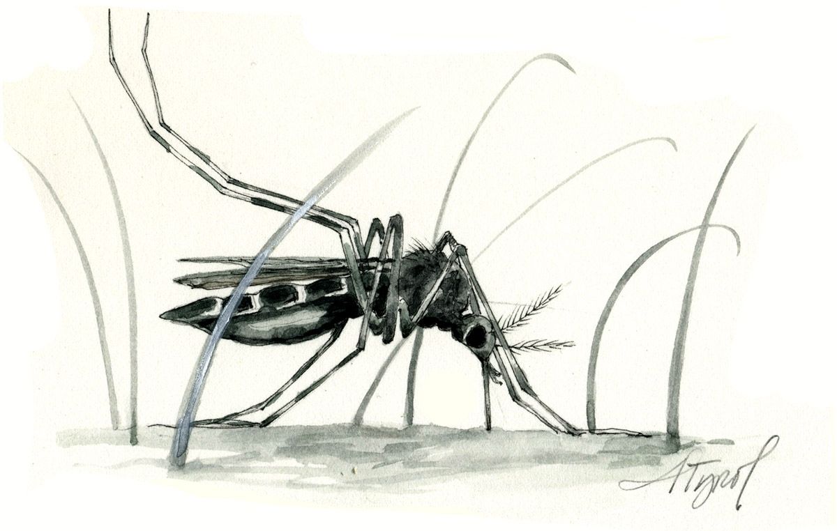 When I think “pupa,” I remember my children’s copy of Eric Carle’s Very Hungry Caterpillar. The pupa, or cocoon, sits quietly until a spectacular adult emerges. Mosquito pupae hang from the surface tension, but at the first hint of danger, like the shadow of a passing bird or biologist’s net, they actively swim to depth. And when the danger passes, they bob right back up and take another breath. From the water surface, the adult mosquito, balancing precariously on the skin of its earlier self, emerges vertically, pulling legs and wings out from its still-submerged pupal husk. I would have thought it akin to taking your pants off, one leg at a time. But YouTube videos suggest otherwise: the legs pop out in pairs or all at once and the fly can immediately walk on water or take off directly.