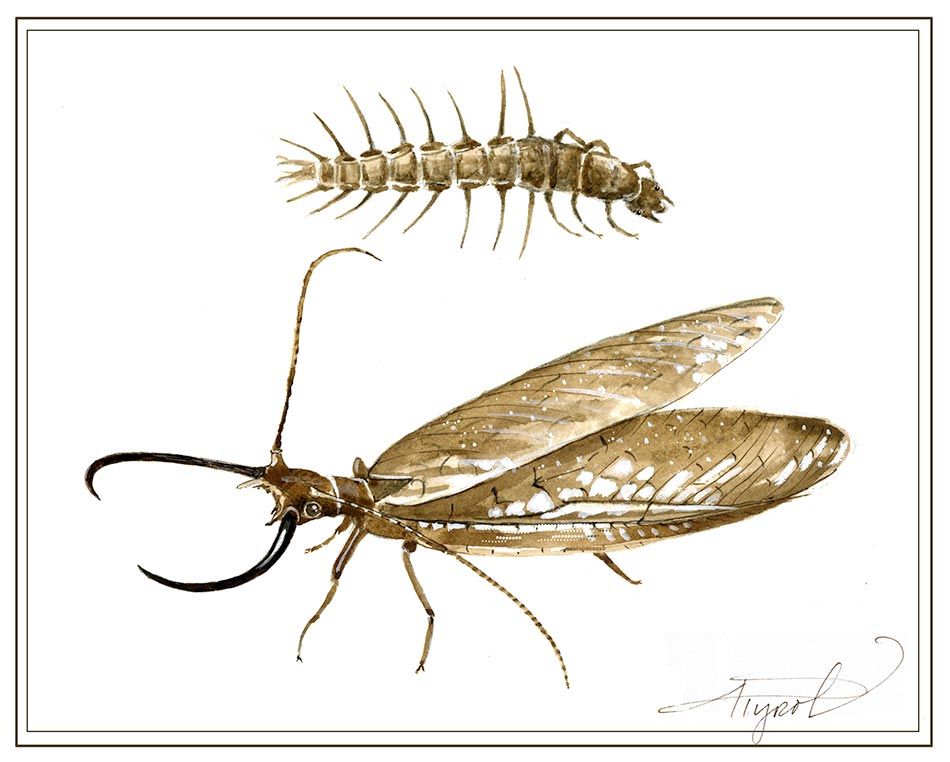 All of these superlatives apply to larval hellgrammites – insects that, upon emerging from the water, promptly change names to become dobsonflies. These fascinating predators spend their larval stage eating other invertebrates, including other hellgrammites. They’re equipped with impressive mandibles that can open wider than the width of their own heads and can handily crunch through the tough exoskeletons of most insects. An occasional angler has learned the hard way that the mandibles of larger hellgrammites are quite capable of penetrating human skin.