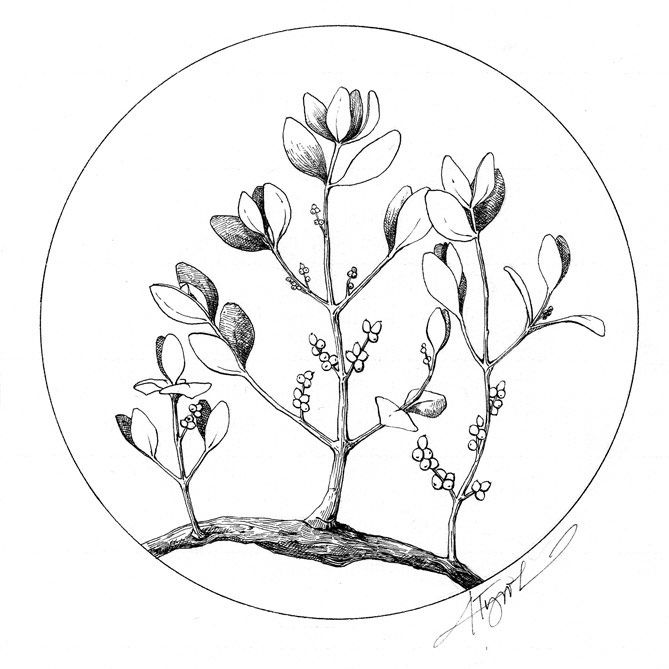 Mistletoe is a parasitic plant. It lives off nutrients from other plants, usually after wedging a root into the other plant’s circulatory system. Mistletoe grows on many types of trees. In ancient times in Europe it was considered an especially potent promoter of romance when it grew on an oak tree.