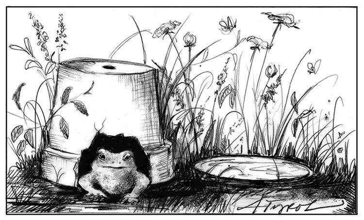 Toads are also drawn to water, so you might build a tiny pond to complement your toad home. Set a birdbath into the earth so that the lip is level with the ground, or dig an eight- to twelve-inch deep depression that measures three to four feet across and is partly shaded. Since toads can’t climb out of a pond if the edge is steep, make sure one side slopes down gently. Line the hole with plastic. Create a small patch of gravel on part of the bottom and spread a thin layer of mud over the rest where dragonflies and damselflies can lay their eggs; the nymphs will hatch into adults that eat lots of garden pests (and in the meantime, will prey on any mosquito larvae). Don’t add fish to the pond or they’ll eat everything else.
