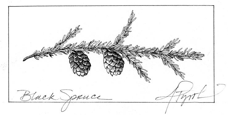 The often-stressful environments of black spruce can produce stunted trees with short, scarce branches, culminating in a scruffy and narrow or club-shaped crown. Even the healthiest specimens rarely match the dense, handsome crown of white spruce. Don’t get the impression that all white spruces are handsome, though, as this species sports those large, ugly, tumor-like galls, useful in some locales for immediate identification.