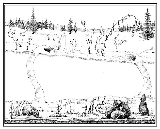 It is easy enough to study this hidden habitat. Look for an air hole in the snow and dig a pit straight down next to it. If you’re lucky, you may discover an intricate system of rooms and hallways. The most elaborate contain a sleeping area, a breakfast nook, a food cache corner, and a latrine. Long, narrow tunnels connect everything. For convenience, most tunnels begin where there is a tree trunk, large rock, or thick bush. These dark surfaces also absorb solar heat, helping to moderate the temperature of the animals, the plants, and the ground itself.