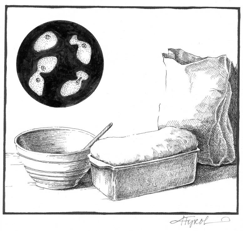 Yeasts, used by mankind for thousands of years, were probably the first type of microbe to be used for domestic purposes. A particular kind of yeast, Saccheromyces cerevisiae, makes bread rise by producing gases as they metabolize and reproduce. There is something highly satisfying about being in a warm kitchen on a cold day and watching a quiescent mass of water, flour, and yeast change and swell and become loaf-like. It’s food that is literally alive – until we eventually kill all the yeasts within the bread by baking it.