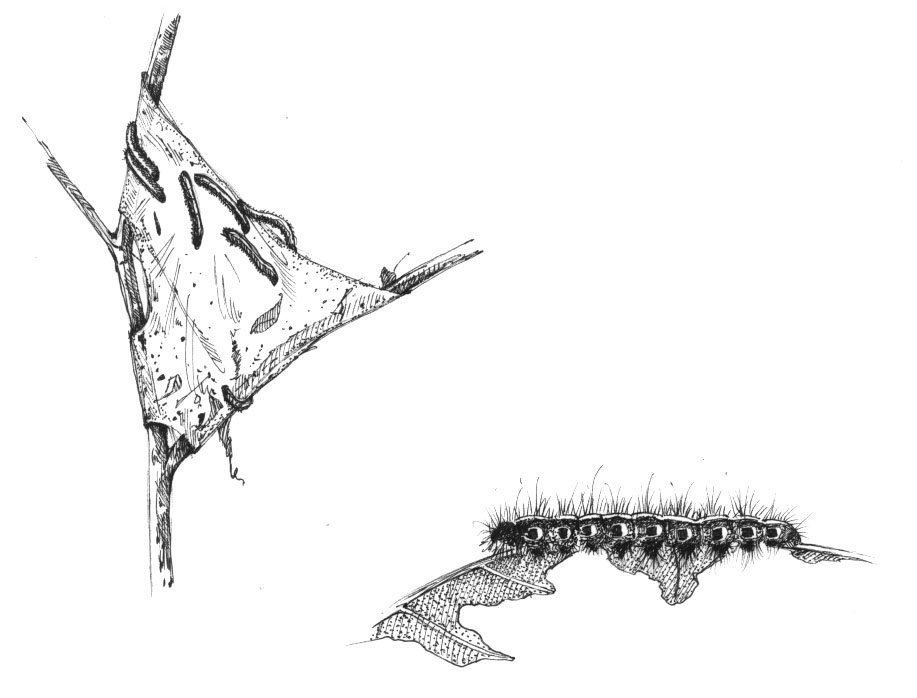 Fall webworms build large, unsightly tents high in the branches, usually in roadside trees or trees at the edge of fields. The silken tent starts out being tiny, covering just a leaf or two when the caterpillars are newly hatched. As they feed and grow, so does the tent, and after molting five or so times and reaching a length of one inch, the caterpillars are in housing that is sometimes three feet high and is filled with dead leaf skeletons, droppings, expired family members, and shed skins.