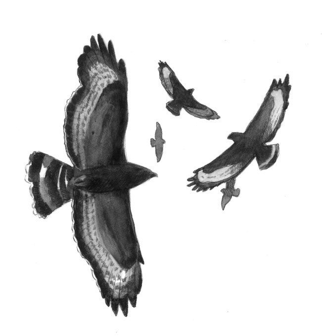 Broad-winged hawks leave Canada and New England a month before their food runs out to ensure that the presence of thermals will carry them south. Each flock spirals up a column of heated air, high, sometimes thousands of feet in the sky. At the summit of a thermal, they streamline their bodies and coast downward, often for miles, to the next rising column of air. Because thermals are not produced over large bodies of water, broad-wings do not migrate over the Gulf of Mexico, instead gathering in flocks, called kettles, which sometimes number in the hundreds of thousands as they travel down the length of Central America. By late October, the sun has sunk, thermals have weakened, and our portion of the sky is washed clean of broad-wings.