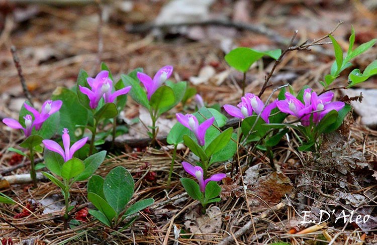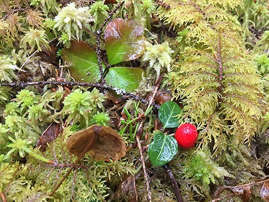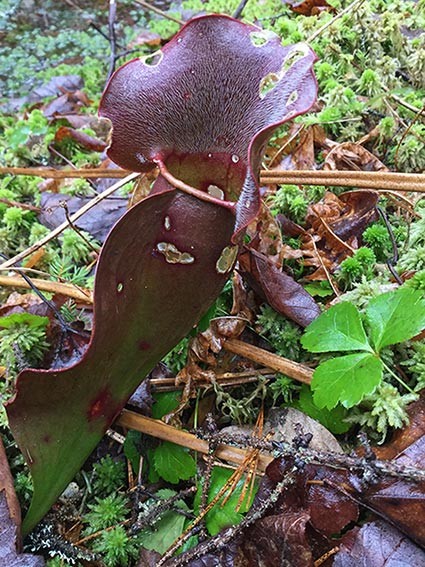 First of three photos: Petersham, MA. Pam Landry took a number of great images from Tom Swamp, “an ancient red spruce, black spruce, tamarack, quaking bog.” Here’s a photo of a somewhat beaten-up purple pitcherplant, Sarracenia purpurea next to three-leaved goldthread, Coptis trifolia. Credit: Pam Landry