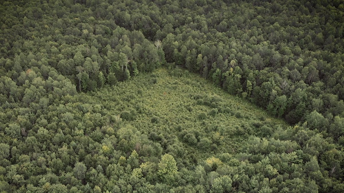 The light green of young trees shows a selective patch of clearcut, West Mountain Wildlife Management Area. Part of the long-term management plan, such cuts will continue to be used to increase biodiversity and improve habitat for species ranging from spruce grouse to Canada lynx.