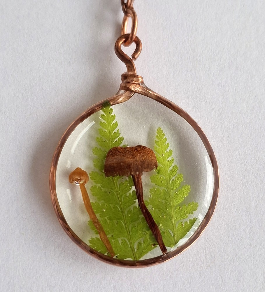 This pendant pairs a real fern and two small mushroom specimens, capturing the grounded, earthy beauty of the forest’s understory. A subtle, organic composition perfect for everyday wear.