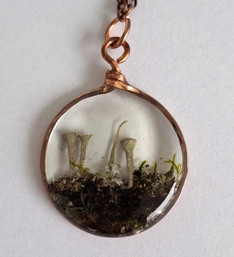 In this pendant, intricate lichen meets a soft cushion of moss, creating a naturally layered design in muted, earthy tones. It carries the feeling of a small woodland vignette.