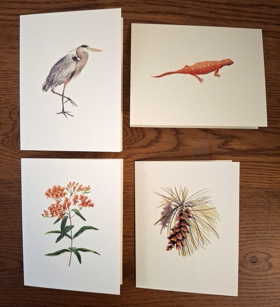 Bring the beauty of the Northeast’s forests and meadows to your correspondence with this curated set of eight notecards – two cards each of the Eastern White Pine, Great Blue Heron, Butterfly Weed, and Red Eft. Each card captures the unique character and charm of these iconic species in original watercolor illustrations.