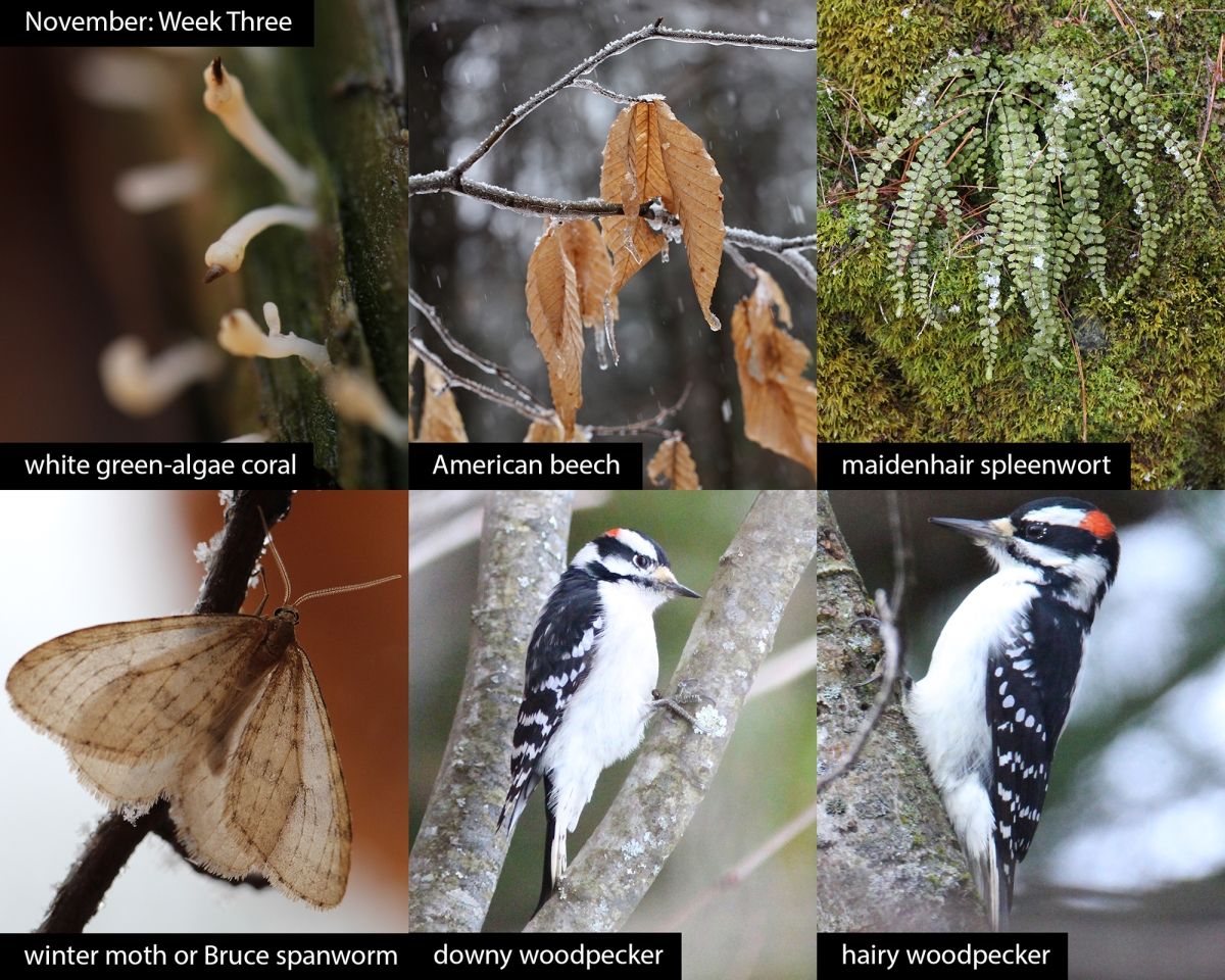 This week in the woods, white green-algae coral (Multiclavula mucida) appeared beside a beaver pond as it often does: regularly distributed across a decaying, moist, barkless log crusted with algae. The late-fall lichenized fungus’s Latin name reflects its appearance: multiclavula for “many clubs” and mucida for “slimy.”