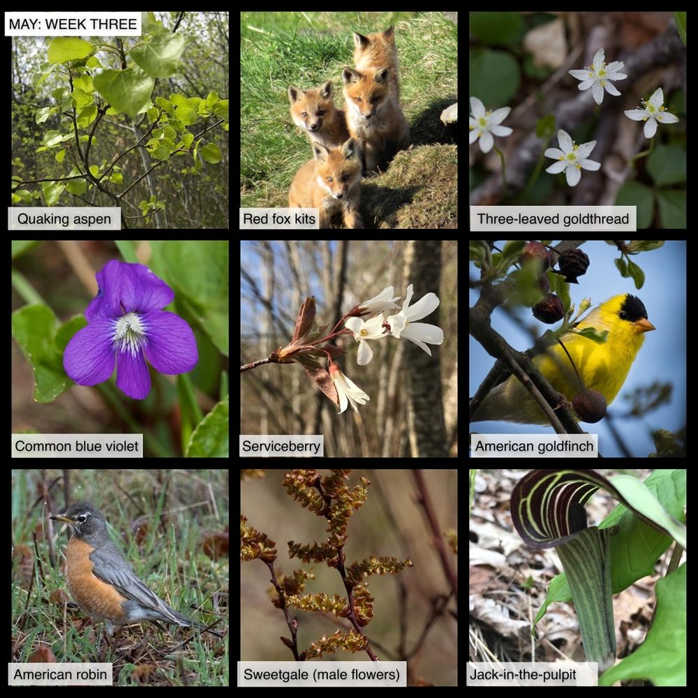 This week in the woods, we’ve been noticing the new, bright green leaves of young quaking aspen. This is an early successional species, meaning that it quickly colonizes cleared areas and other disturbed sites. Fun fact: when you see a thick stand, you’re probably looking at clones connected by an extensive root system. Individual trees are relatively short-lived, but a connected group can live indefinitely, and according to the National Wildlife Federation, “a grove of quaking aspens in Utah is the largest known living thing on Earth. Nearly 50,000 stems protrude from a single root system. The entire organism covers over 100 acres and weighs 6,000 tons.” The tree is also noteworthy for its high wildlife value. See for example this link to the Ruffed Grouse Society, describing the significance of quaking aspen for grouse.