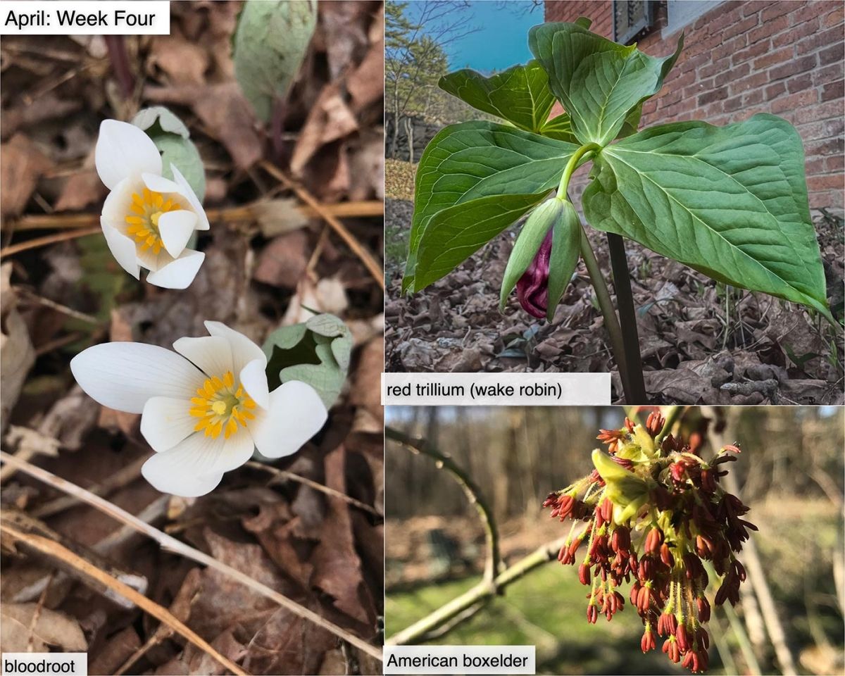 Also – when you’re out looking for spring flowers on the forest floor, a reminder to look up into the tree branches, as well. American box elders, for example, are putting out male and female flowers now (the ones in the photo are males, which are less stringy looking than the female flower clusters, and have stamens that are rusty colored in their early stage).