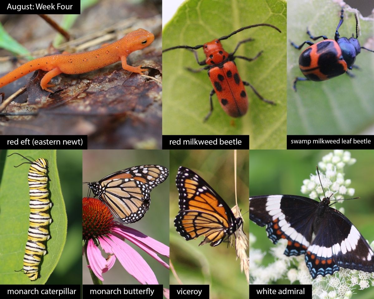 Between now and October, these butterflies and others will confront the cooler months in different life stages. Shortened daylight hours around the beginning of September will trigger the year’s last generation of monarchs to begin migration to their Mexican wintering sites. Like the majority of our butterflies, the non-migratory viceroy will overwinter as a caterpillar, rolling itself up in a willow or poplar leaf, binding the leaf shut with a twig or silk strand, and entering a hibernatory state of diapause. The white admiral observed here, likely part of the year’s second generation, has a window of one to three weeks to reproduce. If it does so successfully, its offspring, the third instar caterpillar, will make a hard-shelled chrysalis in a host tree and wait out the cold. Species like coppers and blues that overwinter as eggs either deposit them on the twigs of hosts or in the leaf litter around their base so that they will have food when the plants sprout and leaf out in the spring. Species like the eastern comma (written about in April) use the more unusual strategy of overwintering as adults, and we can look forward to seeing them earliest of all in the spring.