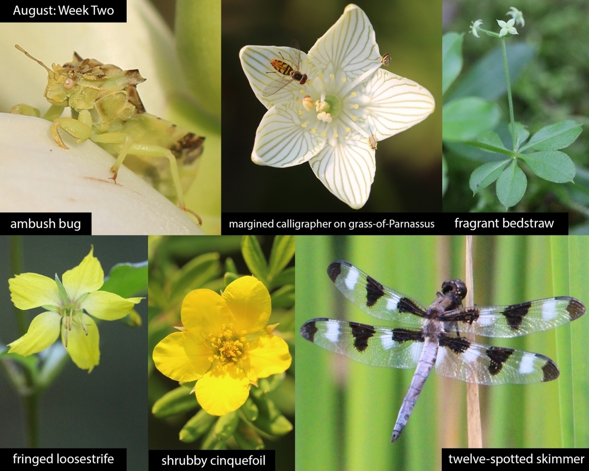 On the margins of the same wetland, fringed loosestrife showed off its star-shaped flowers and hairy-stalked leaves. Like the yellow loosestrife discussed last month, this Lysimachia plant is native to North America and unrelated to the invasive purple loosestrife. Unlike the majority of flowers that offer nectar as a reward to visitors, fringed loosestrife tempts pollinators with oil. Some bee species can add the oil to food for their larvae or line their nests with it for waterproofing. Both grass-of-Parnassus and fringed loosestrife have obligate bee species, which cannot survive or reproduce without their host plant: The parnassia miner lays its egg on a loaf made exclusively from the nectar and pollen of the grass-of-Parnassus, and the common loosestrife oil bee provisions its nests with oil and pollen only from fringed loosestrife.