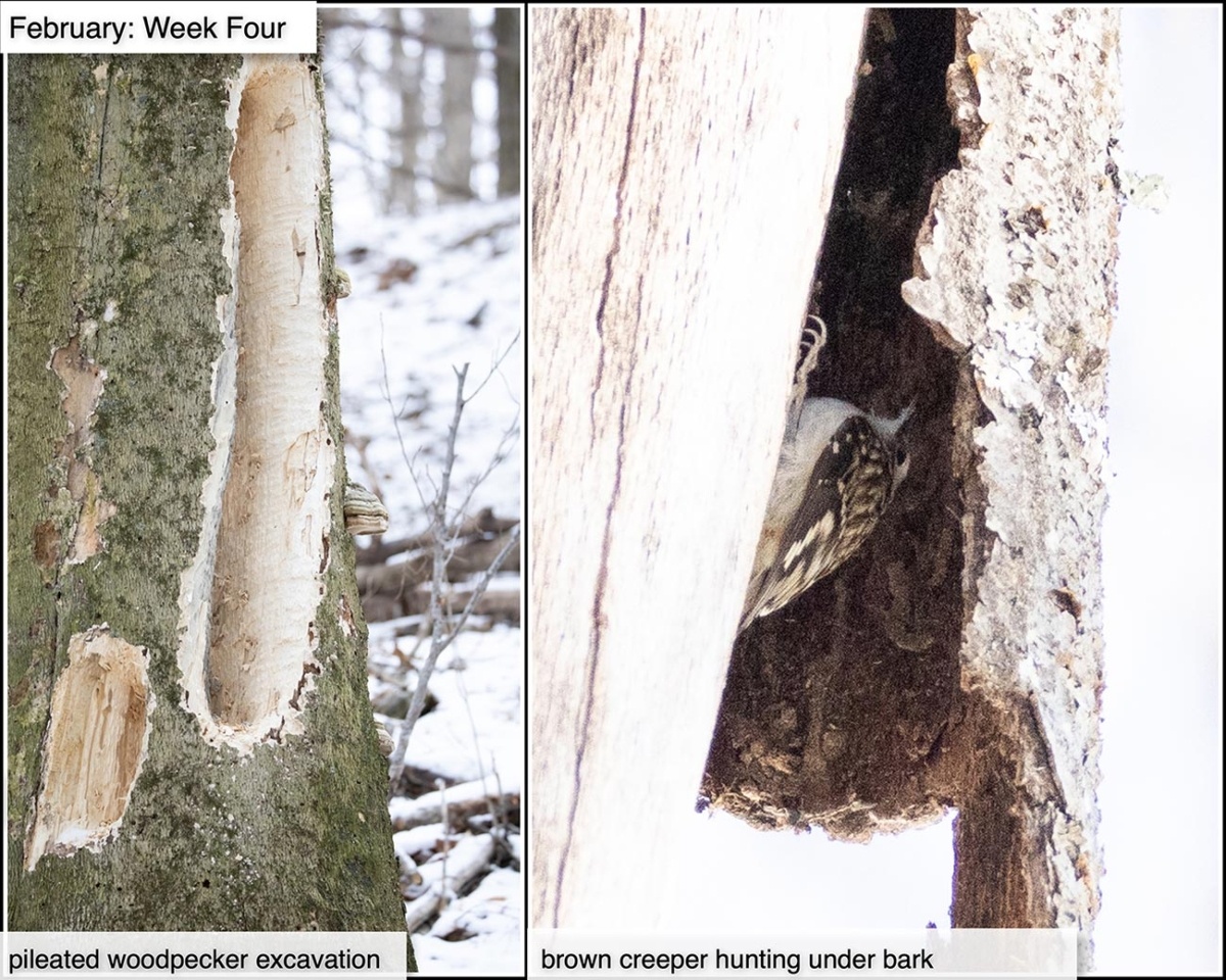 Woodpeckers aren’t the only birds who search out invertebrates beneath the bark of dead and dying trees. Tiny brown creepers will actually scuttle under loose bark to feed on cocoons, spiders and other small prey. We found this creeper gleaning insects in a bark “cave.”