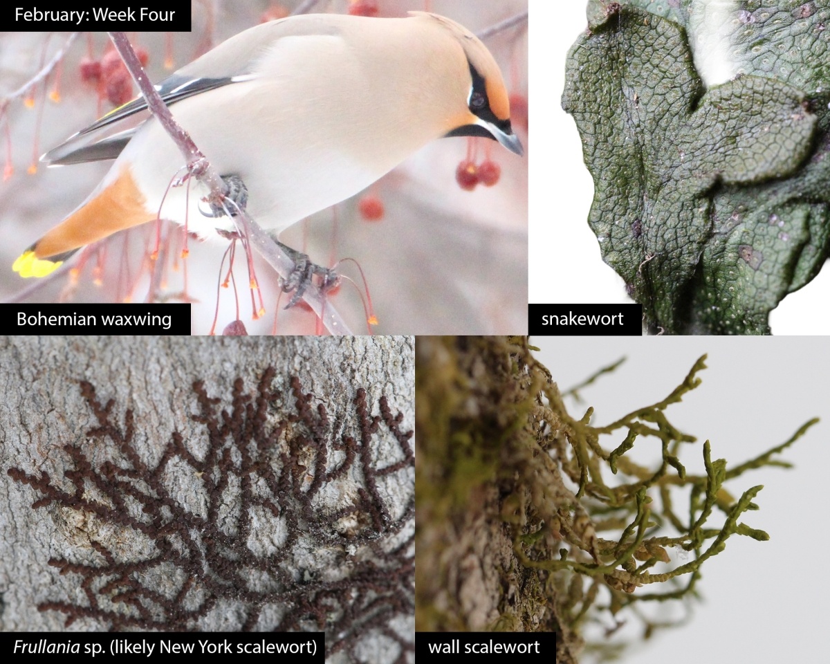 Named for certain lobed species’ resemblance to the liver and perhaps the first plants to make the transition to life on land, liverworts are a group of small, non-flowering plants that lack true roots, stems, leaves, and vascular tissue. In the absence of structures to keep the plants erect or transport water, liverworts tend to grow flat and prefer moist environments. According to Jerry Jenkins, liverworts and their fellow bryophytes mosses “perform vital functions in forest ecosystems by retaining water and slowly releasing it to the soil, reducing erosion along streambanks, helping maintain humidity, and facilitating the decay of logs and disintegration of rock into soil by holding moisture.” Substrates are an important determinant in what liverwort species grows where, and with its varied topography and bedrock types, the Northeast has a high diversity of liverworts. Three liverwort species brightened the snowy landscape for us this week.