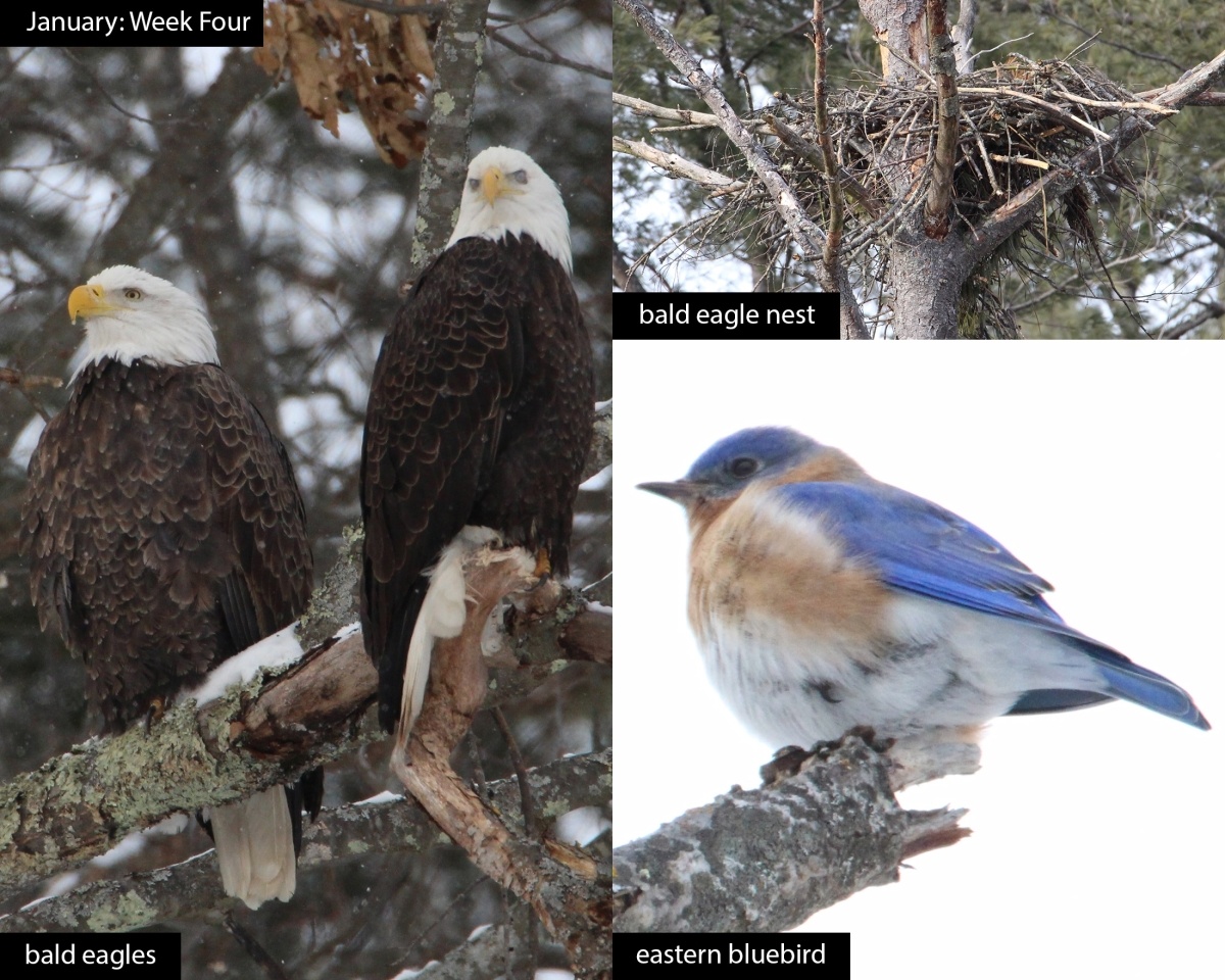 This week in the woods, we encountered a pair of bald eagles that had begun rebuilding a nest in Lyme, New Hampshire. Many overwintering birds, like the bald eagle to the left, fluff up their feathers to trap warm air closer to their bodies. The mid-blink eyes of the bird on the right show their glaucous third eyelids, or nictitating membranes. All birds (and many other animals, such as housecats) have these semi-transparent lids, which move front to back, clear debris, and moisten the eyes. They enable some diving birds to see underwater and close protectively when woodpeckers’ bills hit wood.