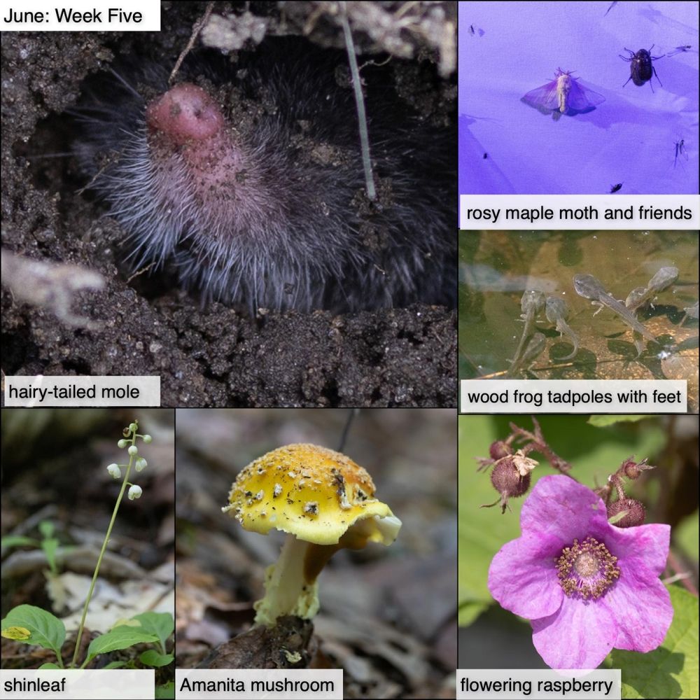 Remember that vernal pool that you visited back in April, to scope out amphibian eggs? It’s now roiling with plump wood frog tadpoles, many of them testing out tiny frog feet. The tadpoles don’t have a strict timeline for development. If the vernal pool’s water remains cool and the food supply plentiful, they may linger as tadpoles, and perhaps get bigger, before moving on to develop frog features. However, if conditions aren’t as favorable, their bodies may rush to develop into frog form – an adaptation that increases their chance of survival.
