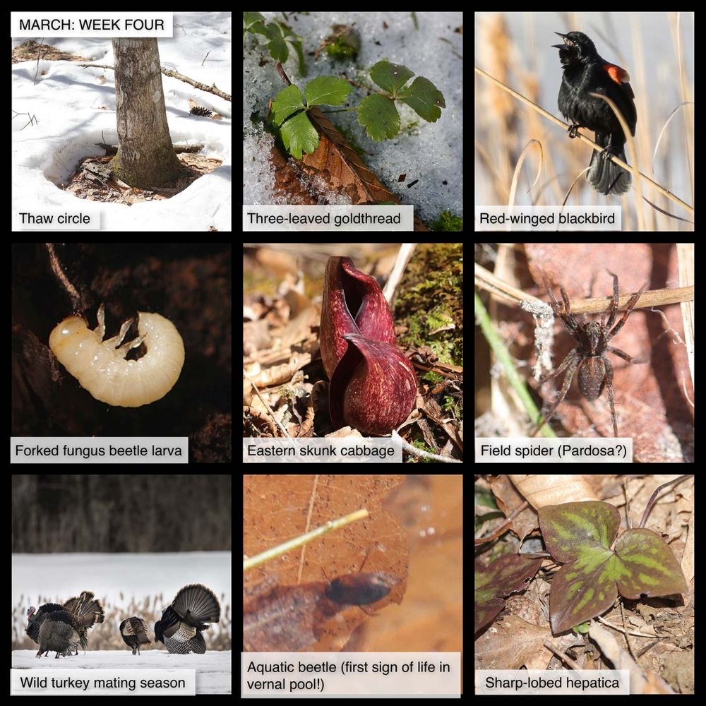 This Week in the Woods, the great spring melt is progressing rapidly. Even on shady, north-facing slopes, you can now see thaw circles – rings of bare ground around the trunks of trees, caused by the bark radiating heat. Here’s an interesting article in Ecology magazine, noting that this phenomenon may be one reason that some early-blooming spring ephemeral wildflowers tend to thrive around tree trunks. As explained by the authors, plants that grow within these thaw circles gain earlier access to the sun and therefore have more time to sprout, bloom, and seed before the late spring tree canopy shades the forest floor.