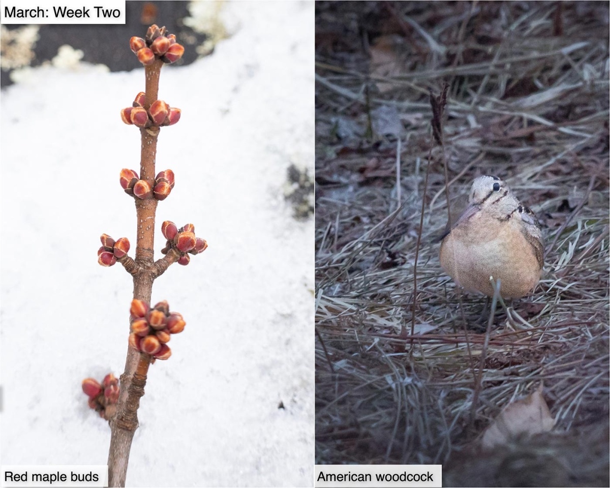 This week in the woods, if all this mud and snow has you feeling a bit desperate to see flowering plants, consider cutting some red maple stems and putting them in a jar of water on a window sill. If you inspect a stem, you’ll see that the buds are starting to swell, and cut stems in a warm house will flower relatively quickly. Most tree flowers don’t get a lot of attention, which is a shame – many of them are beautiful. Here’s a look at three tree flowers of spring, including red maple, from a 2019 “What in the Woods is That?” quiz, and here’s a related Outside Story article by Susan Shea.