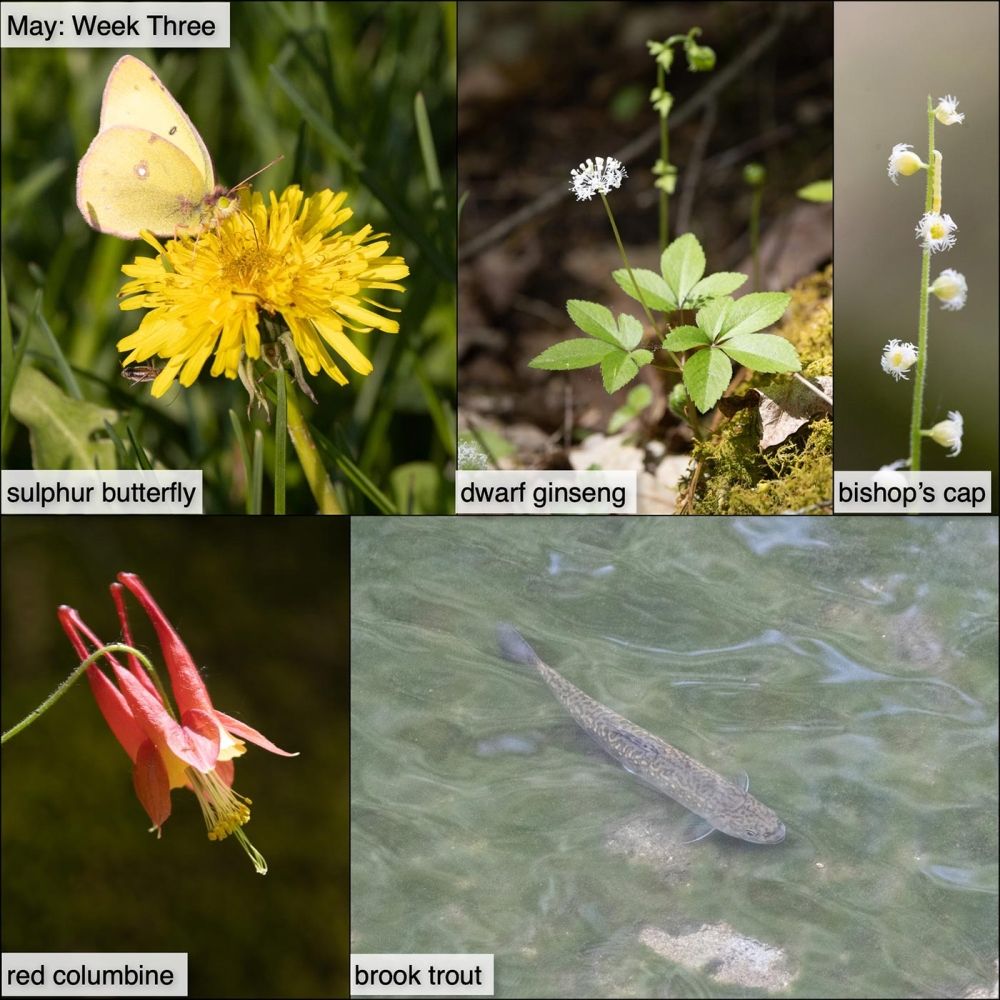 The forest wildflower show continues. Dwarf ginseng is now producing white umbels on stalks above whorls of three or five leaves, and bishop’s cap, a.k.a. twoleaf miterwort, is also in bloom. Its flowers are so itty bitty (about .3 cm wide) that you’ll likely need magnification to see the feathery petals. They’re worth the extra effort – bishop’s cap flowers really are some of the most exquisite spring blooms. Notice, too, the lemon-colored caterpillar in the macro photograph, presumably some sort of moth larvae.
