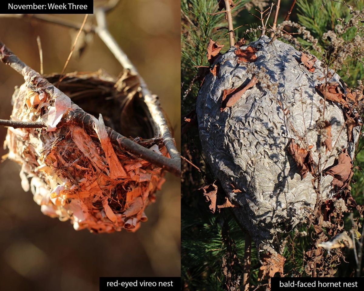 This week in the woods, we can take a closer look at some vacated nests, now more visible among the bare branches and withered greenery.